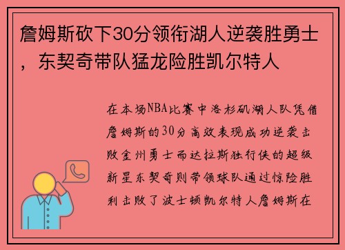 本文将围绕詹姆斯领衔洛杉矶湖人队再次冲击...