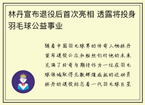 随着中国羽毛球界的传奇人物林丹宣布退役,...