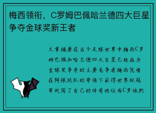 文章摘要:在当今足球世界中,梅西、C罗、...