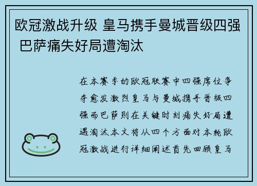 在本赛季的欧冠联赛中,四强席位争夺愈发激...