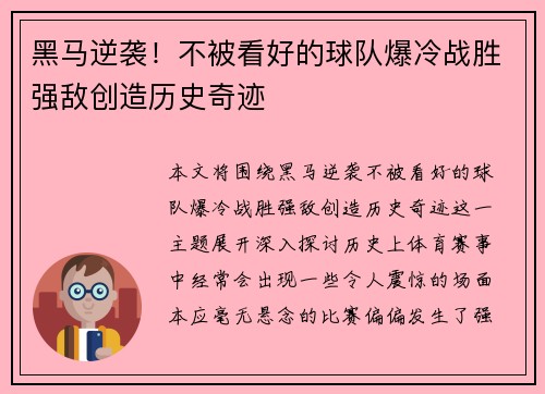 本文将围绕“黑马逆袭!不被看好的球队爆冷...