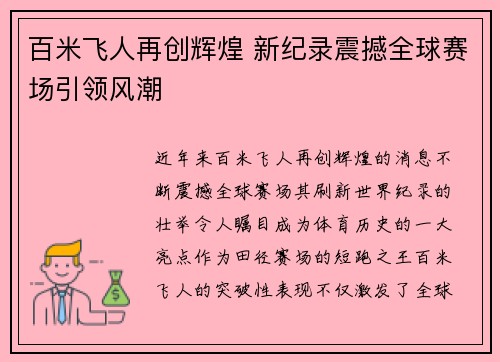 近年来,百米飞人再创辉煌的消息不断震撼全...