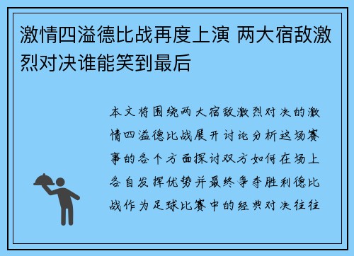 本文将围绕两大宿敌激烈对决的激情四溢德比...