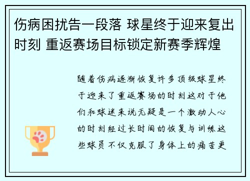 随着伤病逐渐恢复,许多顶级球星终于迎来了...