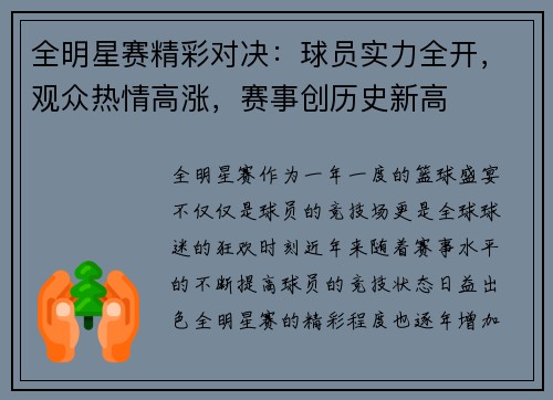全明星赛作为一年一度的篮球盛宴,不仅仅是...