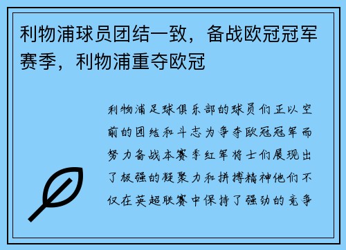 利物浦足球俱乐部的球员们正以空前的团结和...