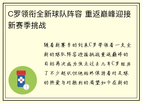 随着新赛季的到来,C罗带领着一支全新的球...