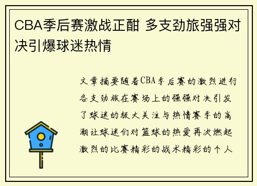 文章摘要:随着CBA季后赛的激烈进行,各...